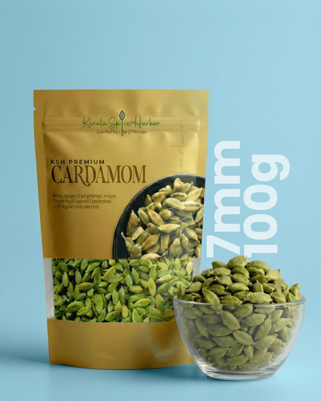 Finely graded bold cardamom pods sized 7 mm, offering a strong aroma, attractive green color, and rich flavor profile. Processed to export quality standards, suitable for premium culinary use, tea blends, and commercial spice applications.