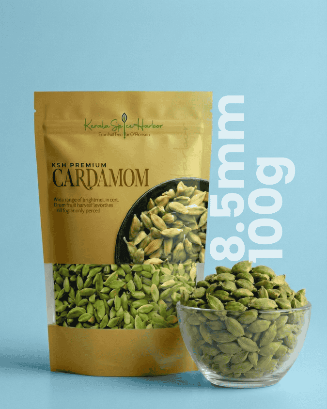 Premium-quality bold cardamom pods with a rich aroma, deep green color, and strong flavor. Carefully graded at 8.5 mm, ideal for export, premium culinary use, and high-end spice markets.